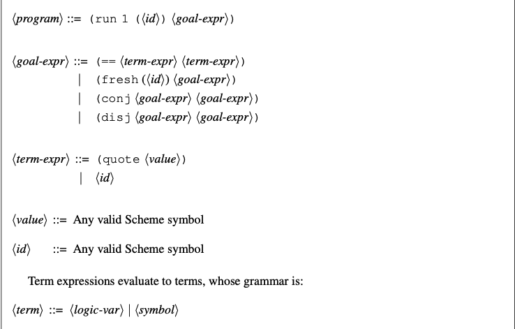 ;; Notice that x is an miniKanren logic variable. Therefore, when evaluating the